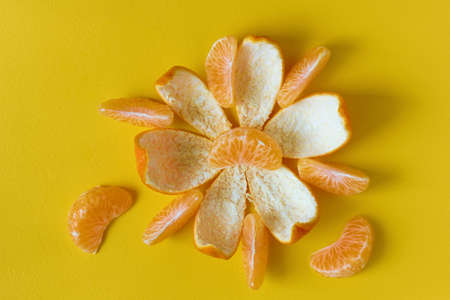 Peeled tangerine on yellow