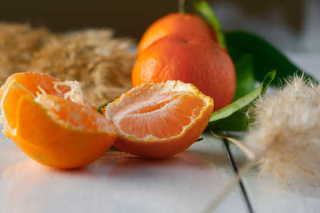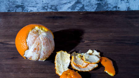 Half-peeled tangerines on an old natural wooden table close-up, space for text