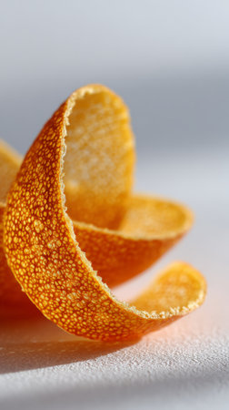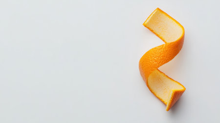 Fresh orange peel forms graceful swirls, capturing the essence of citrus freshness and hinting at the potential for zesty summer detox drinks, herbal infusions, or flavorful additions to recipes