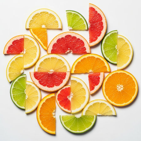 Citrus fruit slices on a white background, top view.