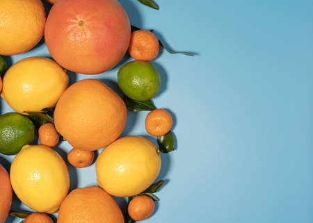 Citrus fruits with orange, lemon, grapefruit and lime on blue background