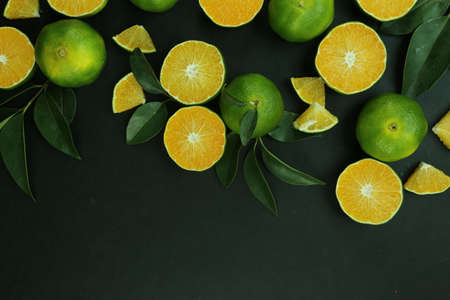 Green sweet tangerines growing with background