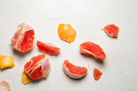 Pieces of juicy grapefruit and peel on a light background