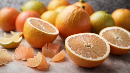 An AI generated illustration of several ripe oranges and lemons arranged on a tabletop