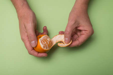 Closeup of hands of man peeling an organic tangerine on green background