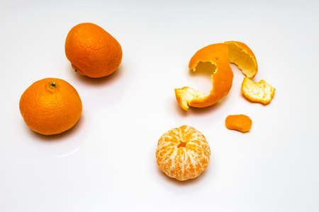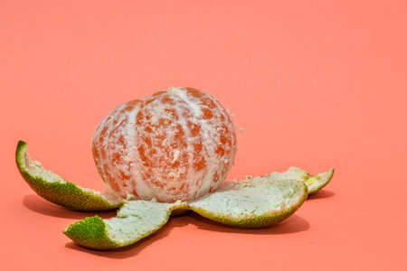 Single Mandarin close up isolated photo. Fresh peeling mandarin with its peel.