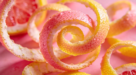 A creative digital illustration depicting Professional creative design of grapefruit zest spiral background in pink and yellow curls, citrus peel textures, bright juicy lighting, zesty vibrant appeal. This AI-generated artwork features unique visual elements suitable for various commercial and editorial applications. AI-generated illustration.