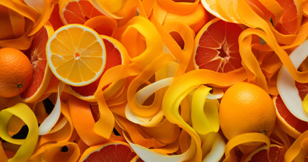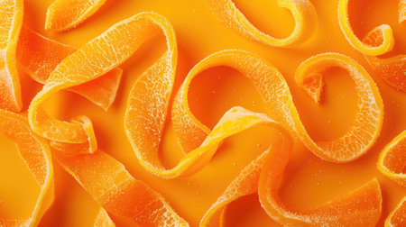 Curled orange and yellow fruit peels with a detailed texture, creating a dynamic, abstract pattern. Bright lighting enhances the vibrant colors and intricate surface details