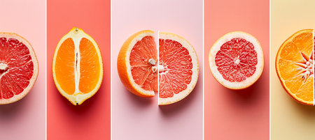Citrus fruit products collage divided with white vertical lines, brightly lit with white background