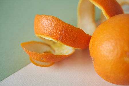Orange peel on a green and white background. Selective focus.