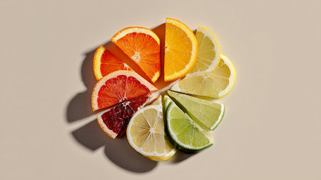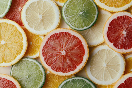 Close-up of sliced citrus fruits, arranged in a colorful pattern.