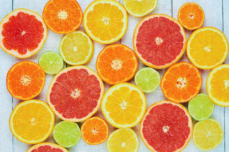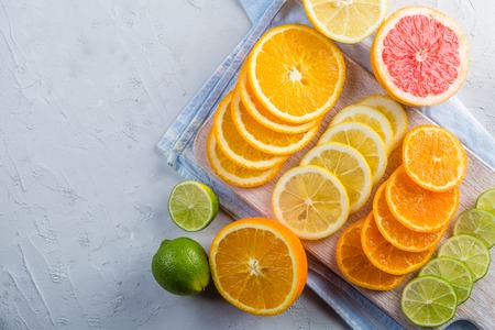 Sliced citrus fruit on a light background. Orange, lemon, grapefruit, lime.