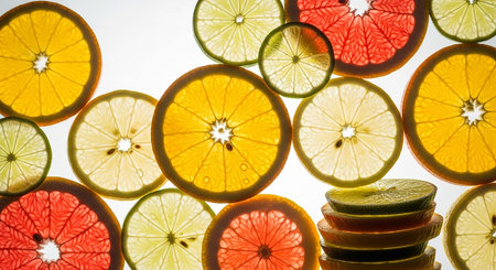 Translucent slices of oranges, grapefruit, lemons, and limes are backlit against a white background.