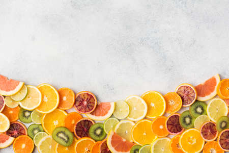 Assortment of citrus fruits and kiwis on white table background, top view, copy space, selective focus