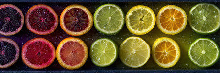 A colorful display of various citrus fruit slices forming a rainbow-like gradient