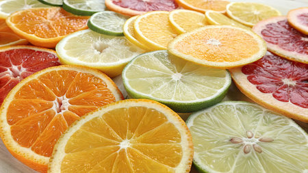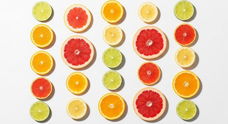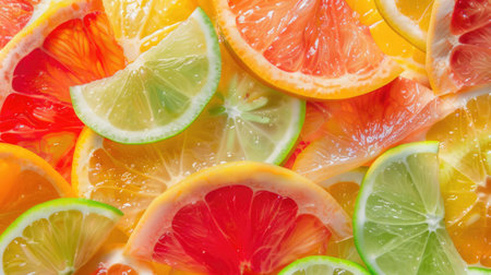 Brightly colored slices of grapefruit, lime, and orange are arranged in an appealing layout, showing their fresh textures and vivid hues that reflect sunlight.