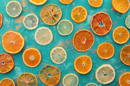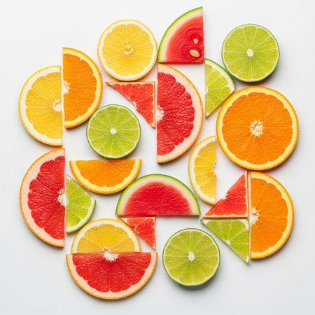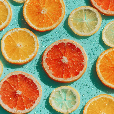 Close-up of sliced citrus fruits, arranged in a colorful pattern.