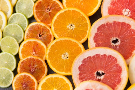 Citrus fruits slices pattern texture background, lime, lemon and oranges flat lay