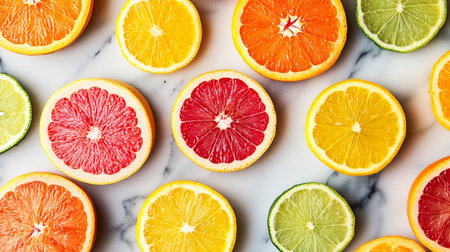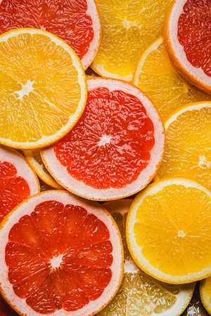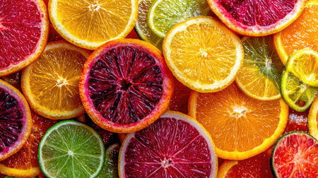Top view of vibrant and juicy citrus fruit slices creating a refreshing and textured composition.