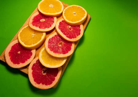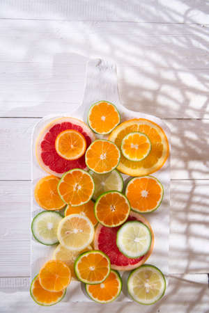 Citrus slices in sunlight, backlit citrus fruits. Freshness and summer concept