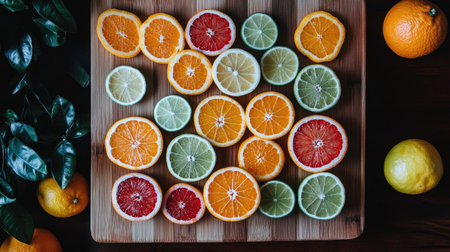Citrus fruit slices arranged in a floral pattern. Colorful and healthy food featuring fresh ingredients and vitamins. A vibrant display of lemons, limes, oranges, and blood oranges. AI Generative AI generated