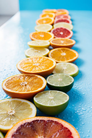 AI Generated. Citrus fruit slices arranged in row on blue background