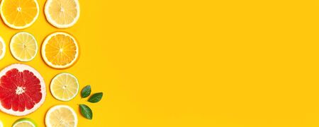 Flat lay composition with slices of fresh lemon orange grapefruit lime green leaves on yellow background top view copy space. Citrus Juice Concept, Vitamin C, Fruits. Creative summer background.