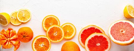 Assorted fresh citrus fruits on white background.Oranges, grapefruits, lemons,tangerines. Clean eating, healthy life. Top view.