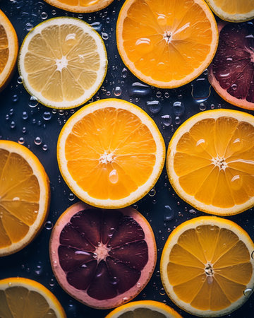 AI Generated. Colorful citrus slices arranged on a dark background