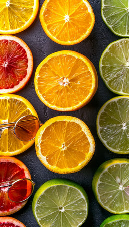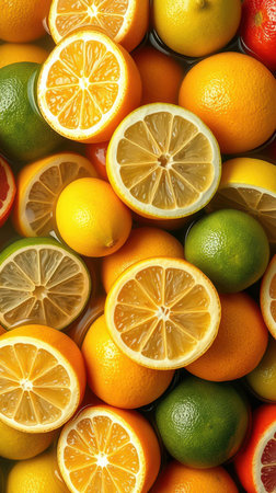 A colorful arrangement of sliced citrus fruits, including oranges, lemons, limes, and grapefruits. Perfect for culinary inspiration, healthy eating, and vibrant displays.