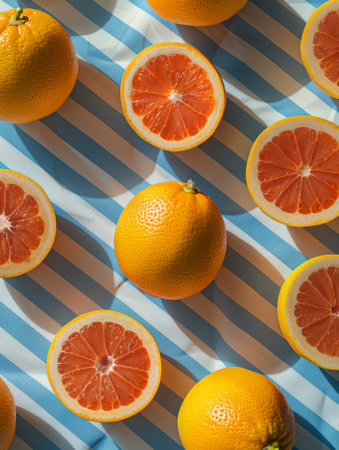Bright and colorful sliced citrus fruits arranged in a pattern, showcasing their juicy, vibrant colors.