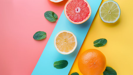 Assorted citrus fruits and fresh mint leaves arranged on a vibrant, colorful background.