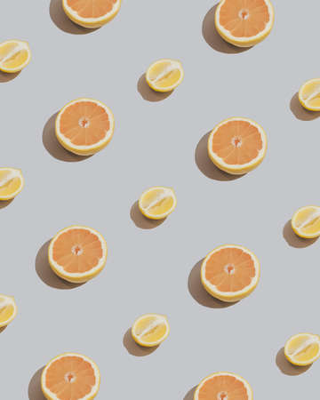 Fresh orange grapefruit and lemon patttern on sandy grey background. Citrus pattern.