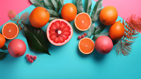 A bright and colorful arrangement of citrus fruits like oranges, lemons, and grapefruit on a vibrant background. Ideal for healthy eating, summer, and fresh food concepts.