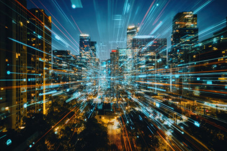 Glowing skyscrapers illuminate the modern city skyline generated by artificial intelligence