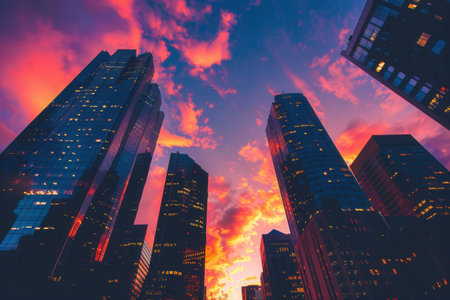 A stunning view of modern skyscrapers silhouetted against a vibrant sunset sky, ideal for real estate and urban development businesses.
