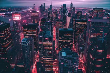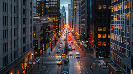 Majestic skyscrapers rise against a twilight background, illuminating the financial district. Streets buzz with activity as the city transforms into a dazzling spectacle of lights and life.