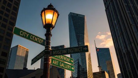 A street sign with illuminated lamp stands in front of skyscrapers. The composition highlights the urban environment and architecture. The sign indicates directions toward the city center, art gallery, and museum district. The lighting suggests a bright, sunny day in the city.