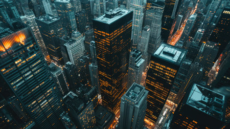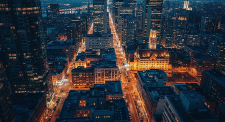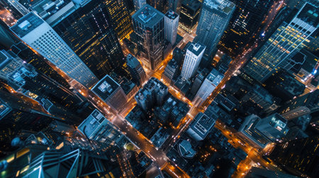 Aerial View of a City at Night With Illuminated Skyscrapers and Busy Streets, Downtown view of a bustling city from a drone's perspective, AI Generated