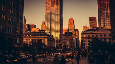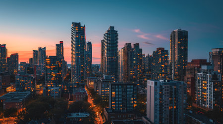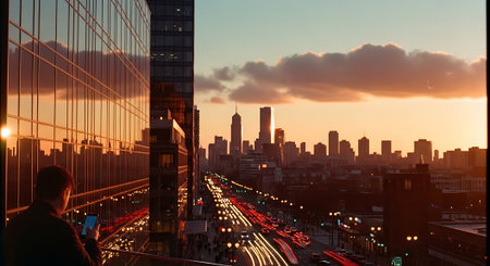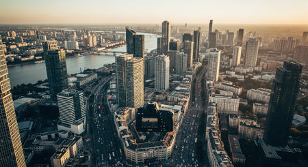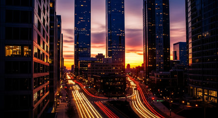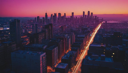 A breathtaking aerial view of a vibrant cityscape at sunset, with reflective skyscrapers and busy streets illuminating the scene as the sun sets on the horizon.