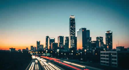 A blurred city skyline at dusk with skyscrapers and light trails from vehicles