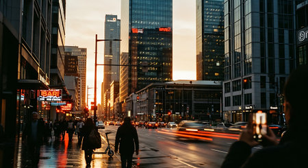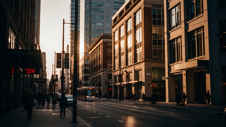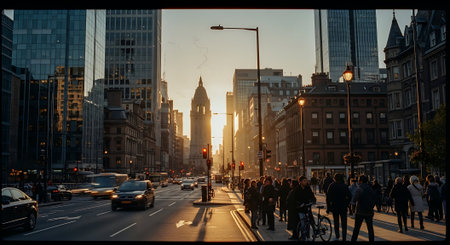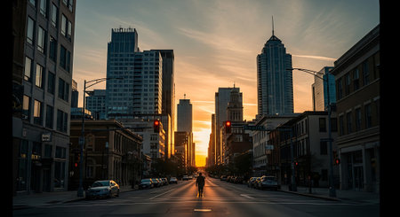A captivating sunrise illuminates a busy urban street, casting warm hues against tall buildings. The scene captures the beauty and energy of city life during early morning hours.