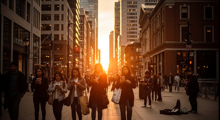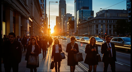 A bustling cityscape at sunset, with silhouettes of people walking along a waterfront promenade, modern skyscrapers reflecting the warm glow of the sun