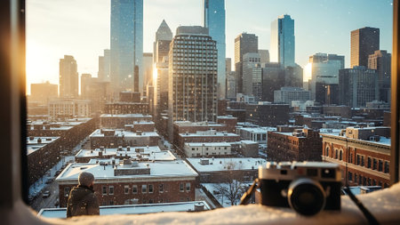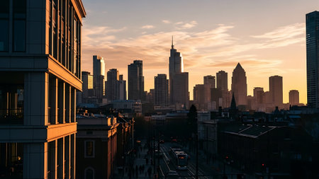 A panoramic view of a city skyline during sunset, showcasing tall skyscrapers and urban architecture, with warm sunlight illuminating the buildings