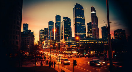 Modern city skyline illuminated at dusk, no people generated by artificial intelligence