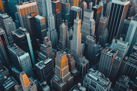 An overhead perspective capturing the bustling cityscape with towering skyscrapers and urban infrastructure, City skyline littered with skyscrapers in varying heights, AI Generated