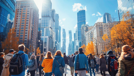 Individuals leisurely stroll along a city street surrounded by skyscrapers, creating an urban and vibrant atmosphere