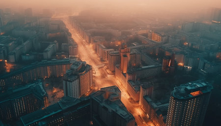 Modern city skyline illuminated at dusk, no people generated by artificial intelligence