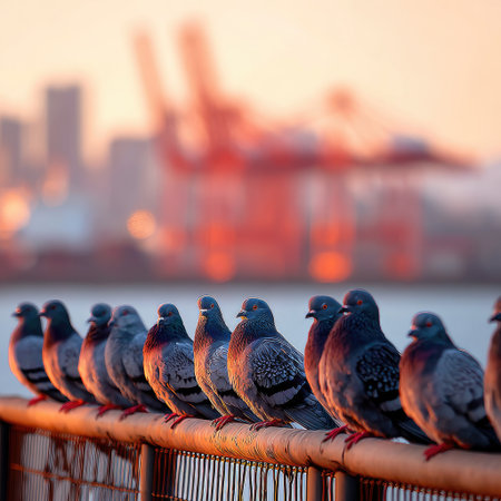 A flock of pigeons sits in a line on a railing with a blurry industrial cityscape.