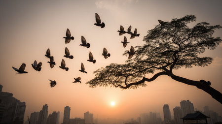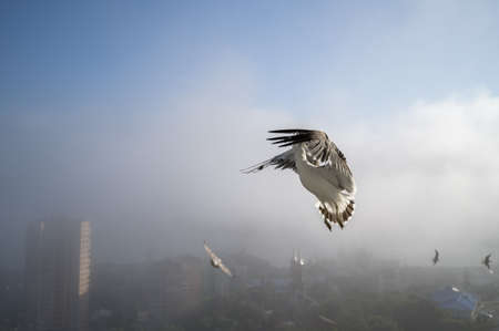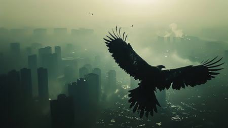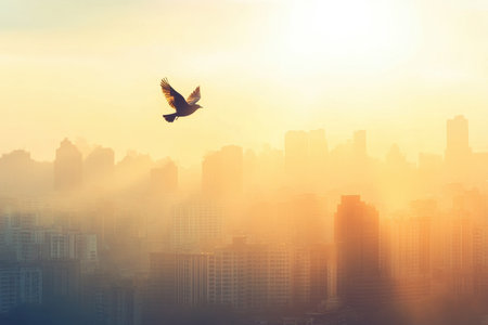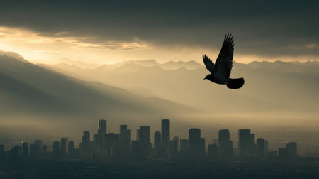 A stunning bird in graceful flight captured against a misty urban skyline. This beautiful image symbolizes freedom and tranquility amidst the bustling city life.
